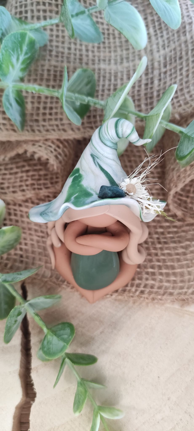 🍃 Gardienne des Forêts Enchantées – Aventurine Verte & Chapeau de Sorcière Fleuri 🌸