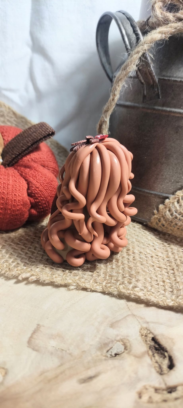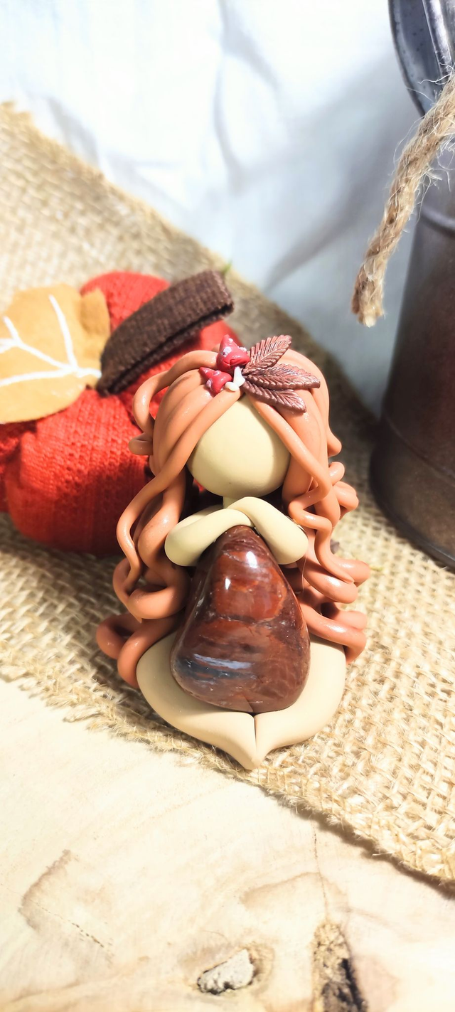 Ses boucles cuivrées, ornées de petites feuilles automnales et de champignons forestiers, célèbrent la magie du renouveau et du cycle naturel de la Terre.