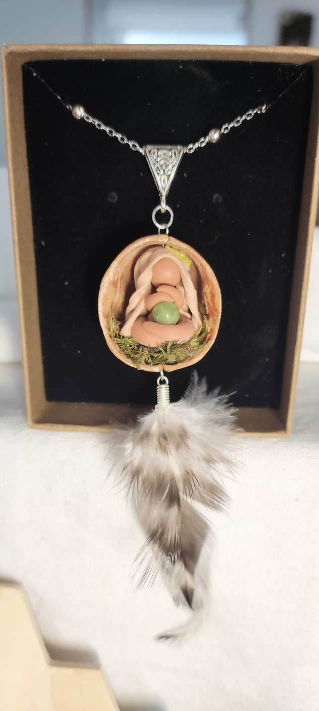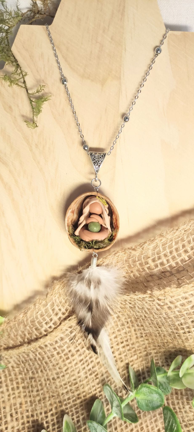 Au creux dâune coquille de noix, symbole de la matrice protectrice, repose une Gardienne aux longs cheveux blonds tressĂ©s, sculptĂ©e avec amour et dĂ©licatesse. Elle veille sur une pierre de jade de ThaĂŻlande, joyau sacrĂ© de sĂ©rĂ©nitĂ© et de renouveau.