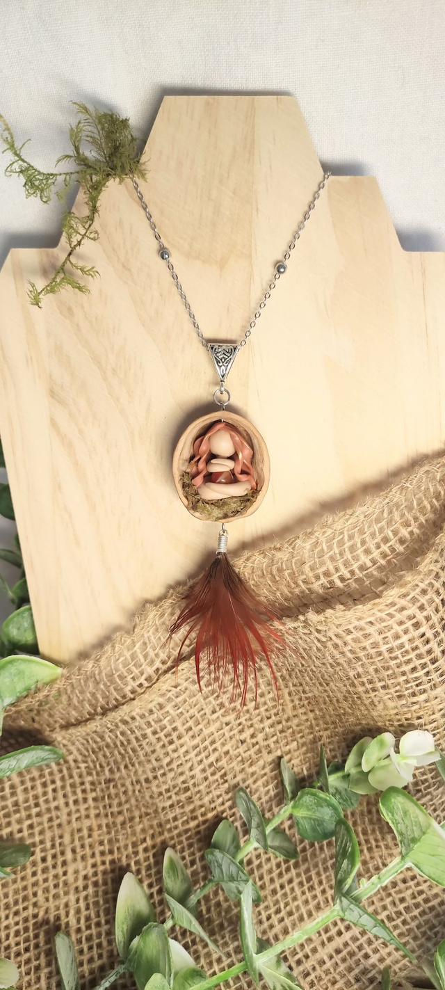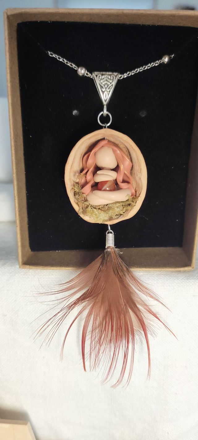 Au cĆur dâune coquille de noix, sanctuaire de bois et de mousse, sâest nichĂ©e une Gardienne aux cheveux roux flamboyants, tressĂ©s comme des rayons de soleil couchant. Elle protĂšge une pierre de cornaline, Ă©clat ardent de vitalitĂ© et de passion.