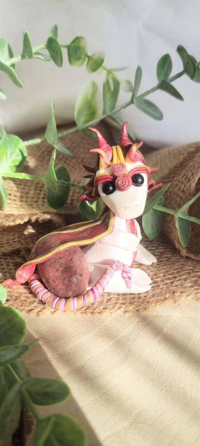 NĂ©e dâune Ă©tincelle dâaurore et dâun souffle de douceur, cette dragonne lumineuse veille sur les cĆurs en quĂȘte dâĂ©quilibre et de paix. Son corps dĂ©licat, drapĂ© dâun manteau rose profond et ornĂ© de filaments dorĂ©s, incarne la flamme bienveillante de la transformation intĂ©rieure.