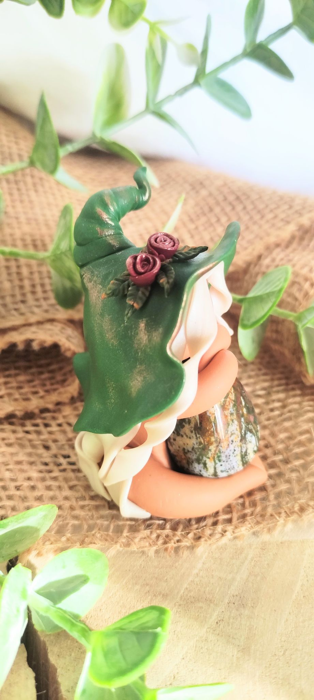 Sous son grand chapeau de sorcière vert mousse, orné de roses sauvages couleur lie-de-vin, la Gardienne des Bois et des Marées incarne la force tranquille de la nature.