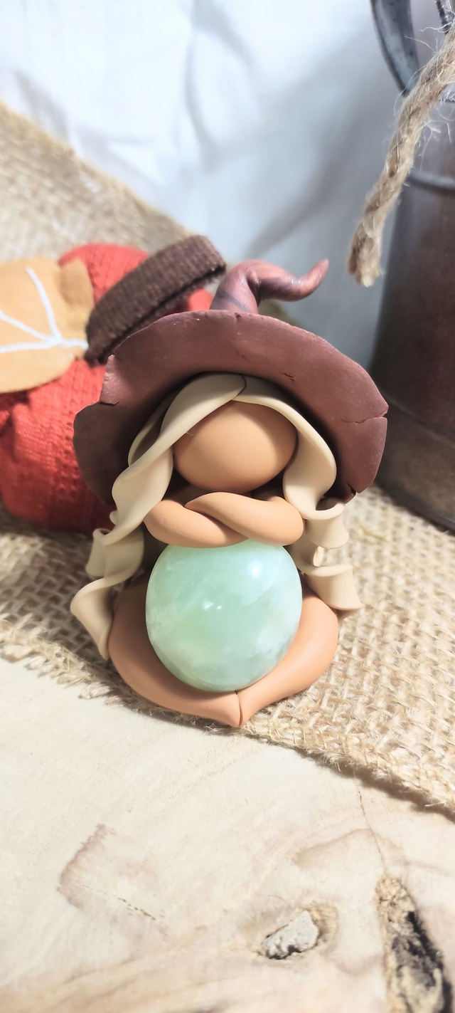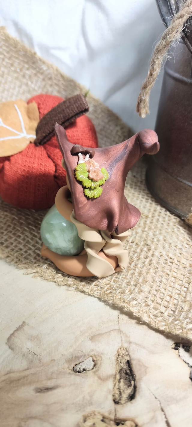 Sous son chapeau de sorcière brun aux reflets boisés, orné de petits champignons et de feuilles, elle veille sur l’harmonie entre le monde visible et le monde vivant.