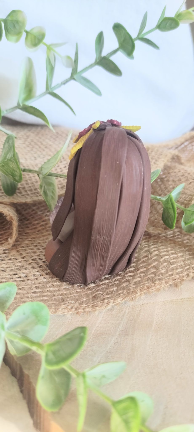 Sa chevelure brune soyeuse encadre avec grâce son visage paisible, tandis que sa couronne de fleurs bordeaux et dorées symbolise l’équilibre entre la profondeur et la lumière.