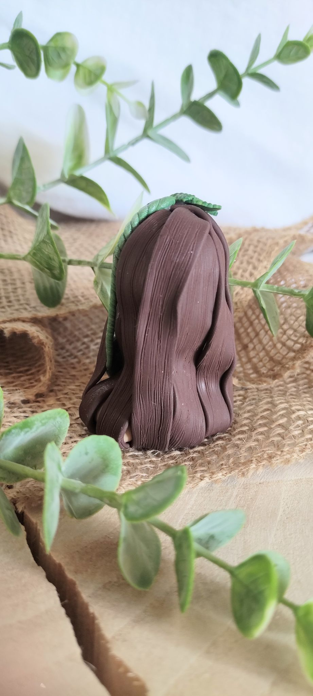 Sa chevelure brune, ornée de feuilles tressées, semble danser au souffle du vent, telle une dryade sortie des forêts anciennes.
