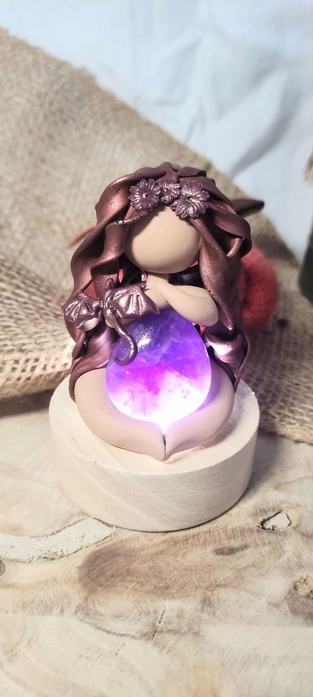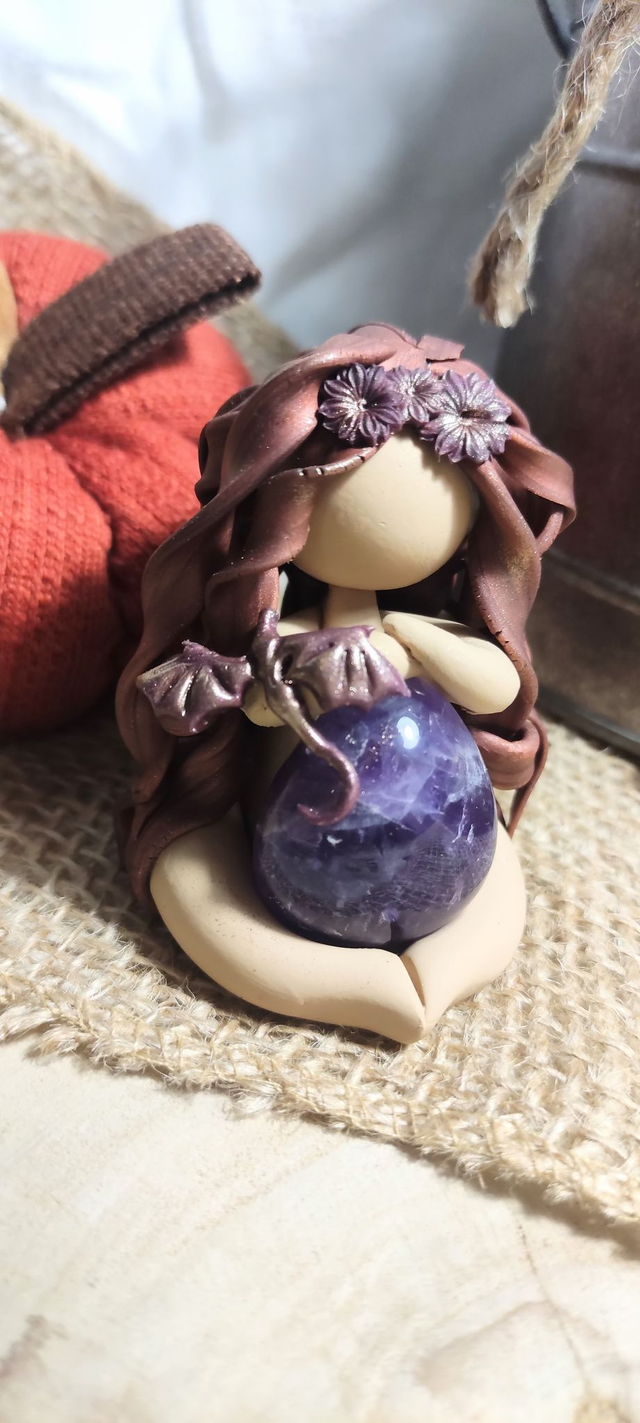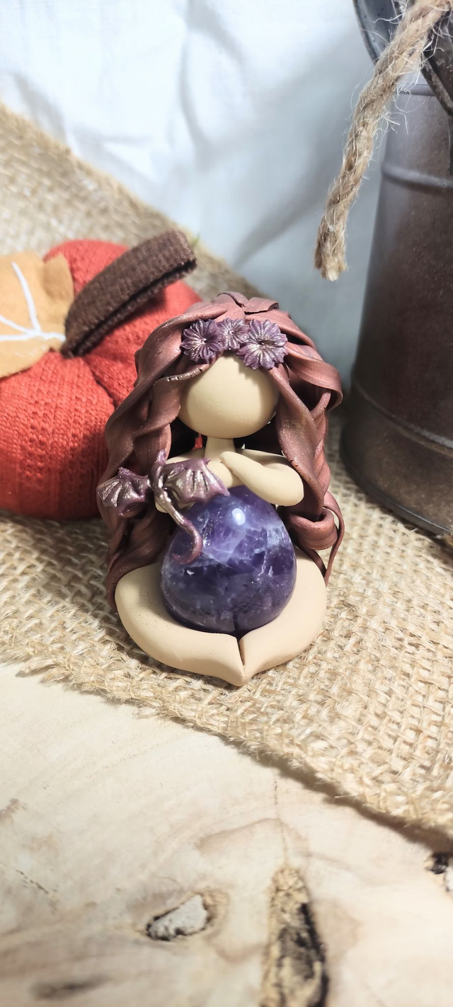 Sur son bras repose un petit dragon, gardien bienveillant des royaumes invisibles, tandis qu’elle enlace une améthyste profonde, pierre de paix et de spiritualité.