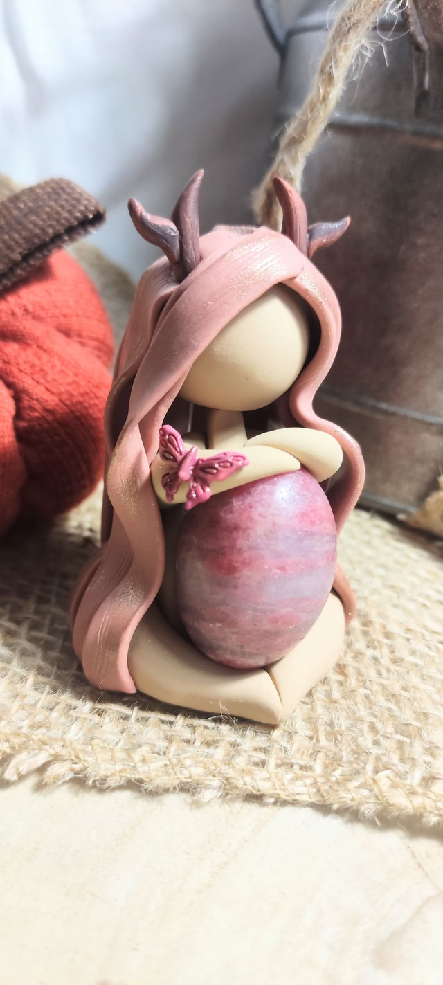 Sous sa chevelure rosée aux reflets de l’aube, ornée de petits bois de cerf symboles de renouveau, elle enlace une rhodonite douce et vibrante.